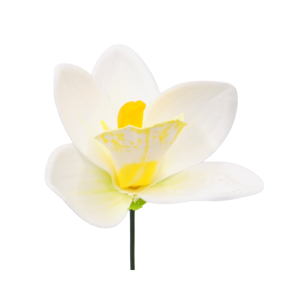 Dirbtinė gėlė iš latekso, baltos spalvos orchidėjos žiedas. Puikiai tinka puokščių, kompozicijų darymui. Dirbtinės gėlės yra ilgaamžės ir nereikalauja ypatingos priežiūros. Pagaminta iš aukštos kokybės latekso medžiagos. Galima naudoti tiek viduje, tiek lauke. Dirbtinės gėlės yra ilgaamžės ir nereikalauja ypatingos priežiūros.