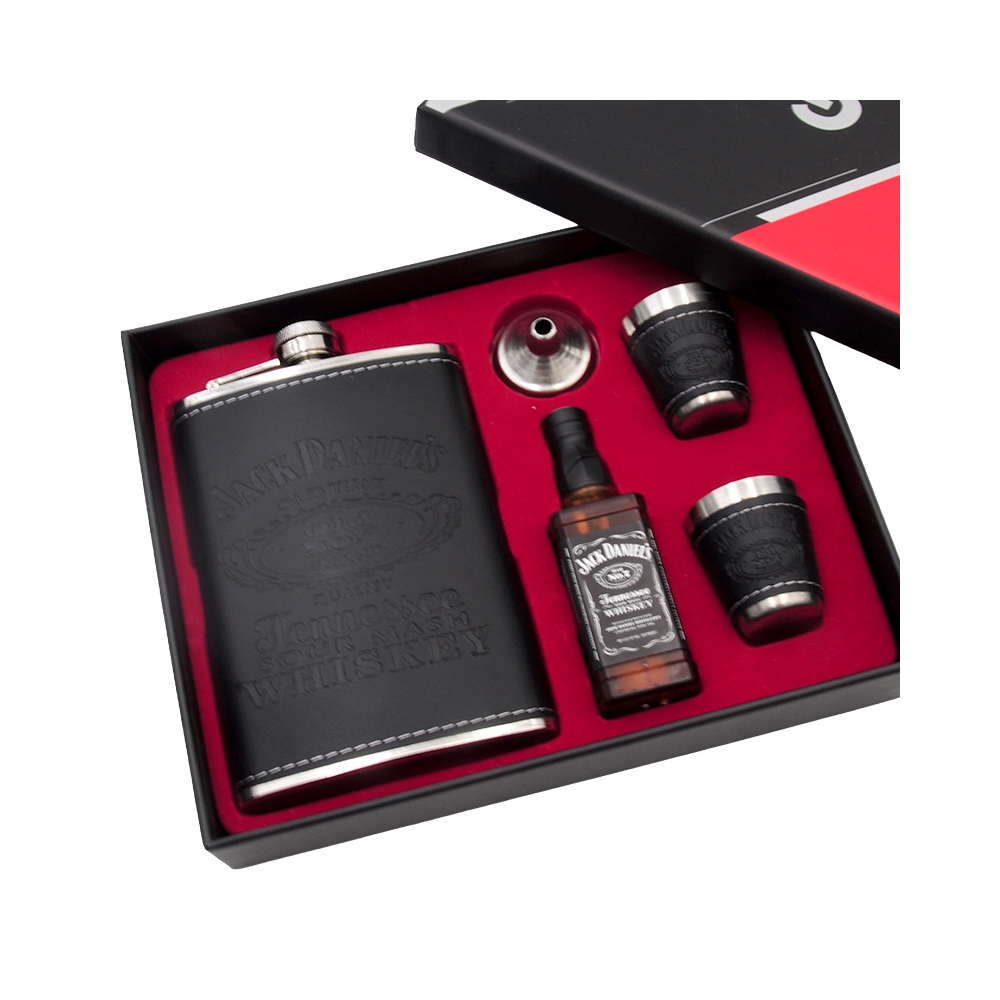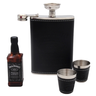 Gertuvė, dvi taurelės iš nerūdijančio plieno ir piltuvėlis, bei dujinis žiebtuvėlis, dovanų dėžutėje.