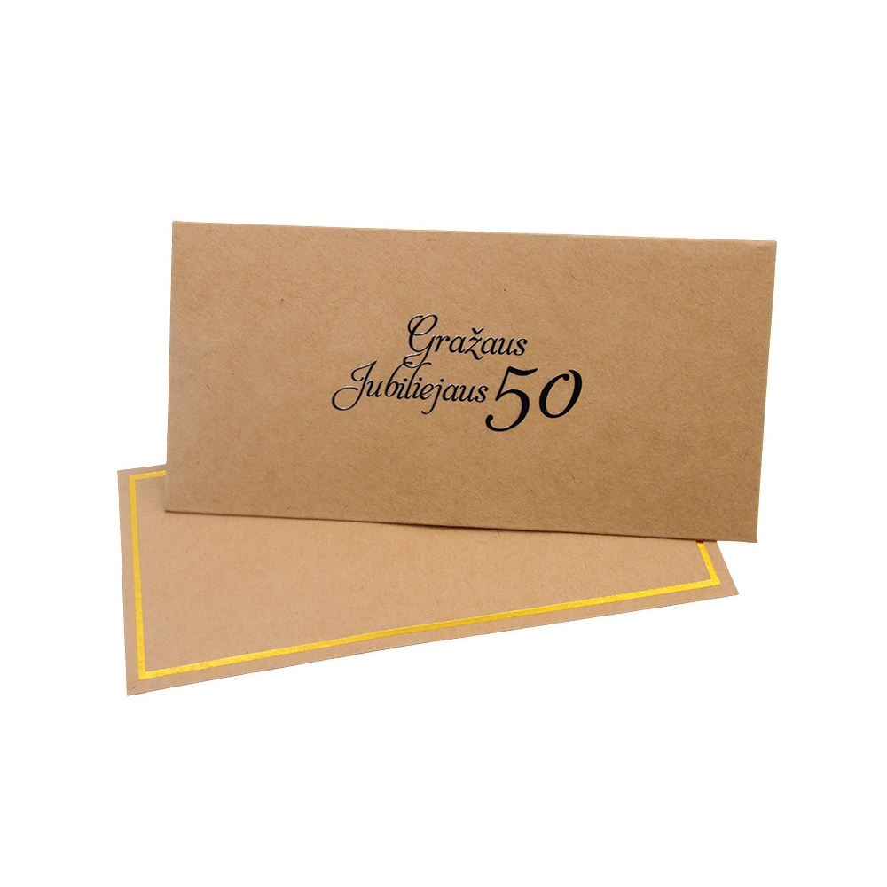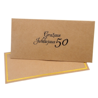 Popierinis vokas su kortele "Gražaus jubiliejaus 50". Stilingi, skirtingų spalvų vokai su auksiniu apvadu – puikus pasirinkimas norint pasveikinti artimą žmogų 50-ojo jubiliejaus proga. Kiekviename voke yra įdėta kortelė, skirta užrašyti asmeninį sveikinimą.