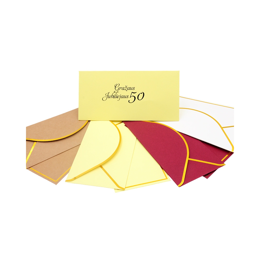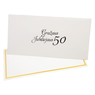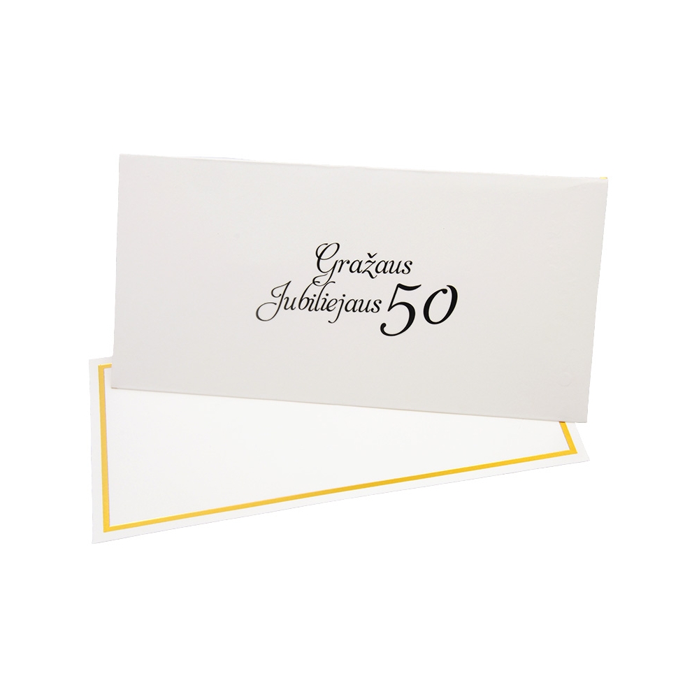 Popierinis vokas su kortele "Gražaus jubiliejaus 50". Stilingi, skirtingų spalvų vokai su auksiniu apvadu – puikus pasirinkimas norint pasveikinti artimą žmogų 50-ojo jubiliejaus proga. Kiekviename voke yra įdėta kortelė, skirta užrašyti asmeninį sveikinimą.