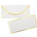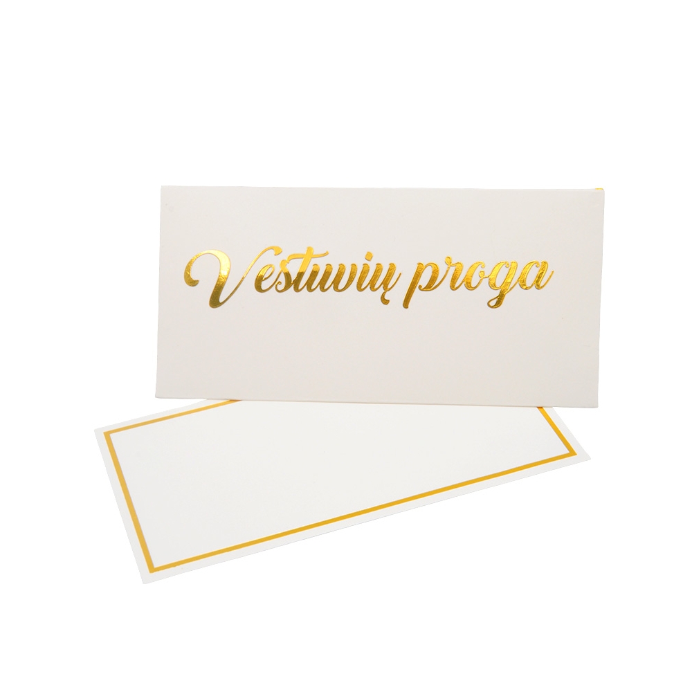 Baltos spalvos vokas su auksiniu krašteliu ir užrašu „Vestuvių proga“ – tai puikus sprendimas norint pasveikinti jaunavedžius. Viduje – tuščia kortelė, kurioje galėsite parašyti asmeninį palinkėjimą ar įdėti piniginę dovaną. Šis vokas tinka tiek dovanai, tiek šiltam linkėjimui.