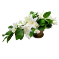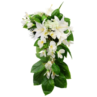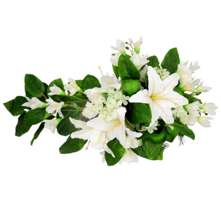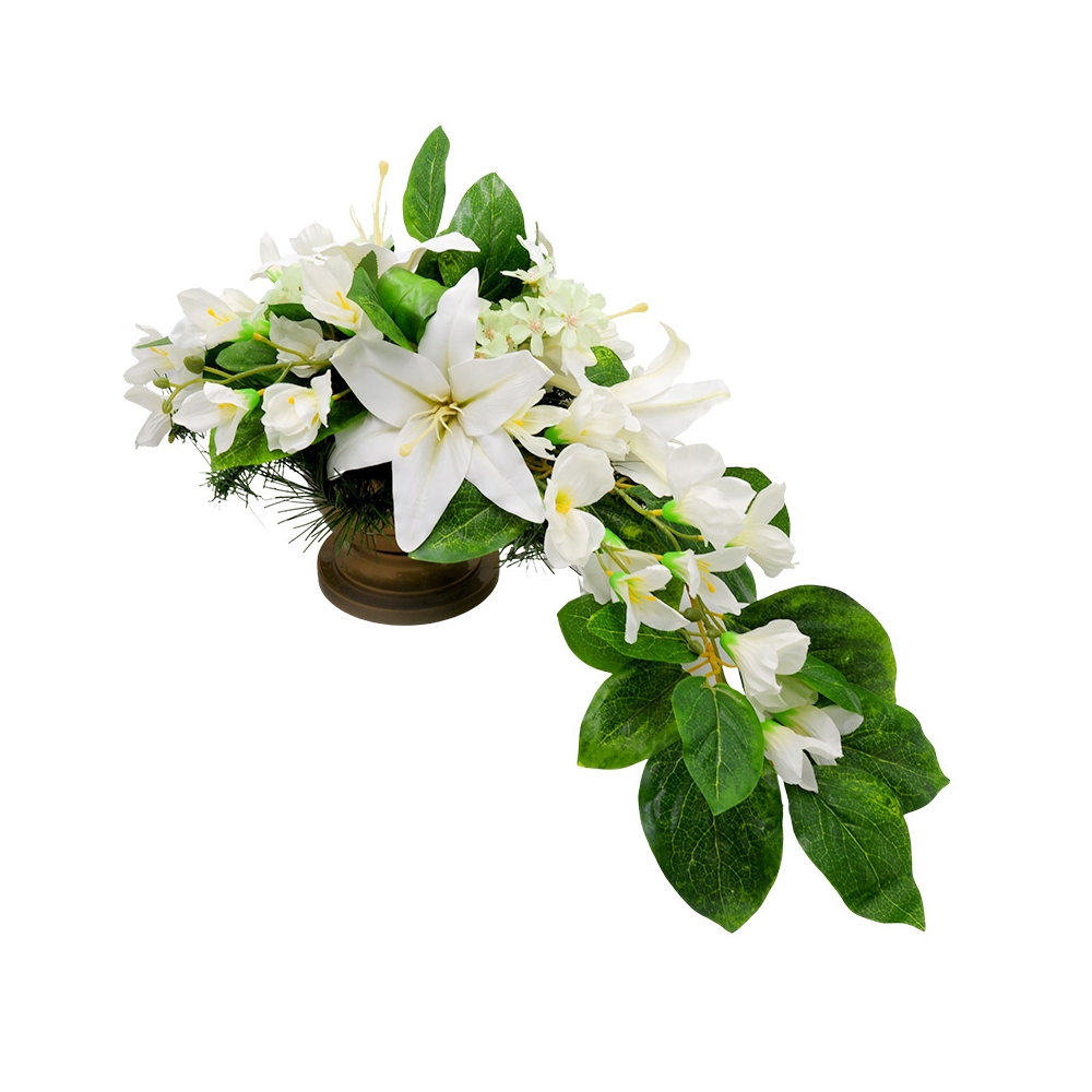 Vėlinių puokštė sukurta iš dirbtinių gėlių, jos pagrindas yra tvirtas ir sunkus. Vėlinių vainikas pagamintas iš baltų 4 lelijų ir frezijų žiedų. Dirbtinių gėlių puokštės, kompozicijas puošti kapus ypač tinka nuo vėlyvo rudens iki ankstyvo pavasario. Kokybiškų dirbtinių gėlių kompozicijos atrodys gana natūraliai ir papuoš jūsų artimųjų kapą ilgam.