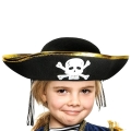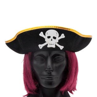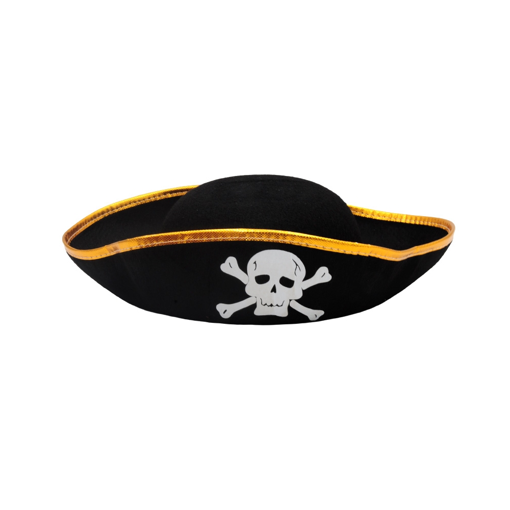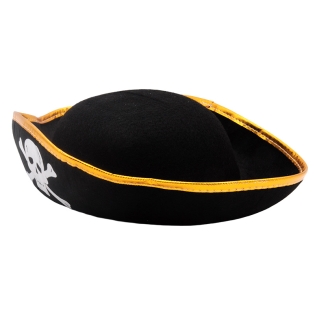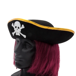 Piratų skrybėlė su auksiniu kraštu – tikram jūrų plėšikui. Kepurė ypač išsiskiria dėl „kaukolės ženklo“ viduryje – gerai žinomo tikro pirato simbolio. Juodos spalvos veltinio imitacija, priekyje – balta kaukolės ir kaulų emblema su auksiniu krašteliu, kuris suteikia prabangos ir išskirtinumo. Puikiai tinka teminiams vakarėliams, karnavalui ar žaidimams.