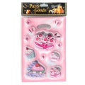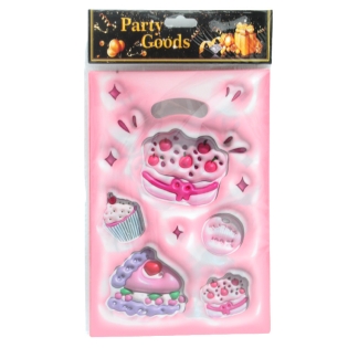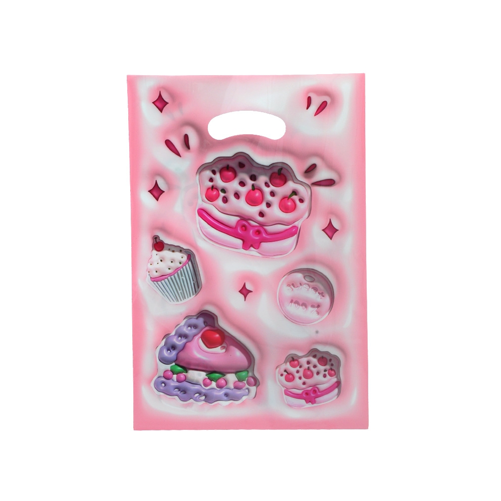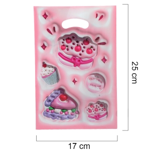 Rožiniai plastikiniai maišeliai su rankenėlėmis dekoruotas spalvingais desertų piešiniais (tortukai, keksiukai, pyragaičiai). Tvirtas ir patogus, puikiai tinka dovanoms, smulkioms prekėms ar saldumynams supakuoti.