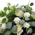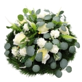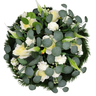 Vėlinių puokštė sukurta iš dirbtinių gėlių. Ji pagaminta iš 6 rožių ir 12 chriznatmeų žiedų. Dirbtinių gėlių puokštės, kompozicijas puošti kapus ypač tinka nuo vėlyvo rudens iki ankstyvo pavasario. Kokybiškų dirbtinių gėlių kompozicijos atrodys gana natūraliai ir papuoš jūsų artimųjų kapą ilgam. Kompozicijos skersmuo apie 60 cm, aukštis 25 cm.