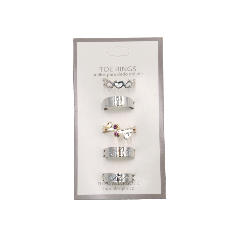 Žiedus ant kojų ar rankų pirštų nešioja pasitikinčios merginos, kurios nebijo išsiskirti iš minios. Jos yra nenuspėjamos, joms neįdomi aplinkinių nuomonė. Siūlome Jums žiedų rinkinį ant kojų ar rankų pirštų, jis prasiplės jums norimo dydžio. Jie pagaminti iš balto metalo skirtingų formų. Žiedo diametras 2 cm. Tinka tiek suaugisiems, tiek vaikams.