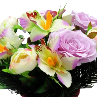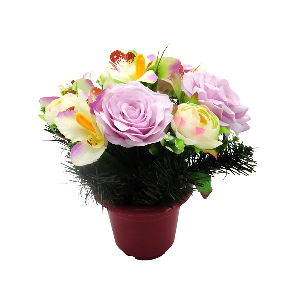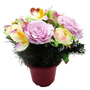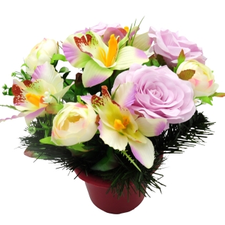 Dirbtinė rožių ir orchidėjų puokštė vazone – patvari, estetiška ir nereikalaujanti priežiūros. Vazonas yra sunkus, su tvirtu pagrindu, todėl stabiliai stovi net lauke. Puikiai tinka kapams papuošti ar namų dekorui.