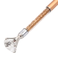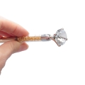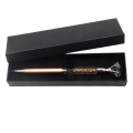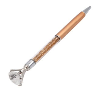 Rašiklis su kristalu – tai ne tik praktiška rašymo priemonė, bet ir stilingas aksesuaras. Auksinis korpusas puoštas skaidriu skyriumi su dekoratyviniais kristalais, o viršuje – didelis brilianto formos kristalas, suteikiantis rašikliui prabangos pojūtį. Puikiai tinka dovanai ar stalo papuošimui. Rašiklis rašo mėlynos spalvos rašalu. Rašiklis įpakuotas į juodą dėžutę.